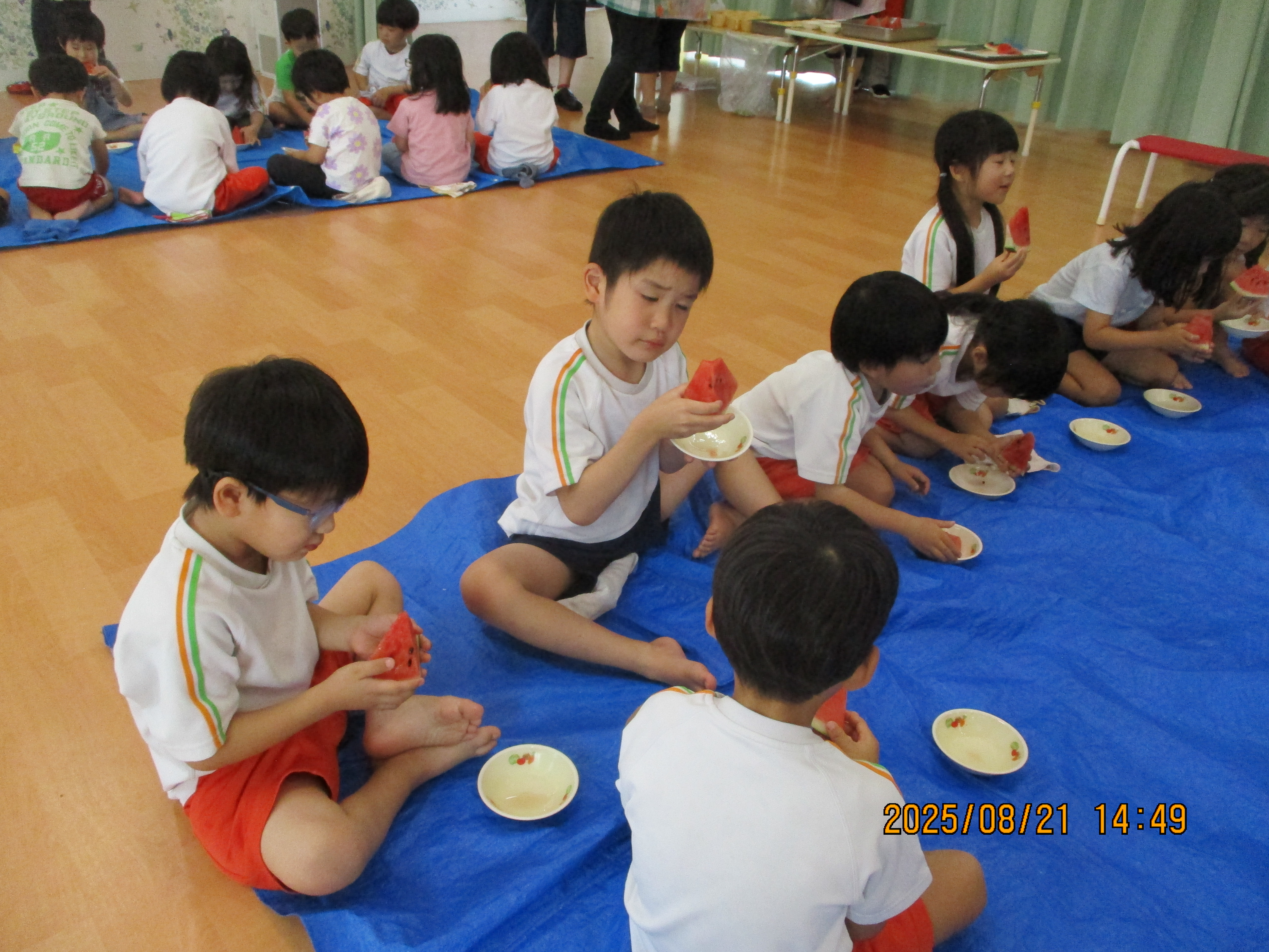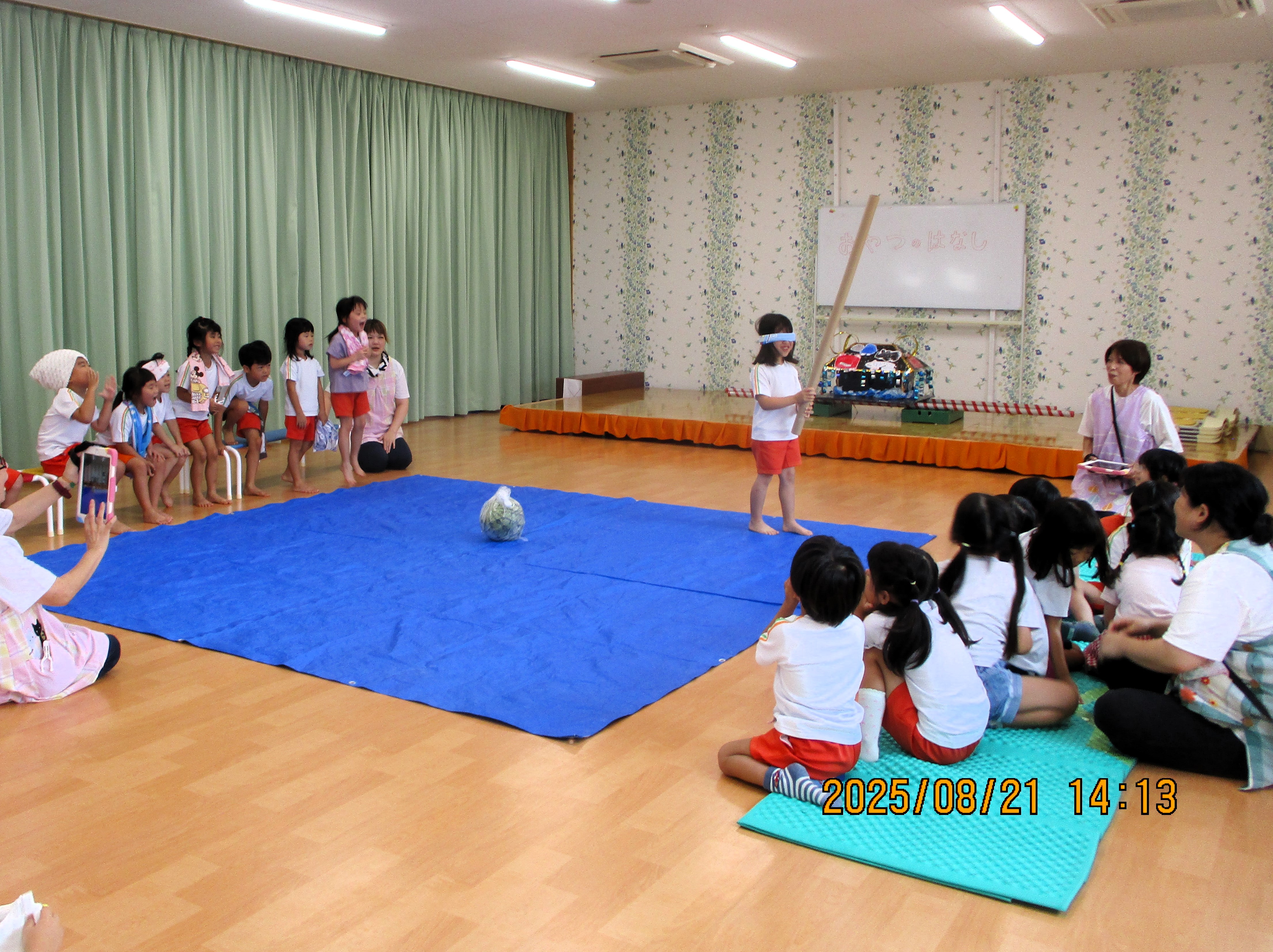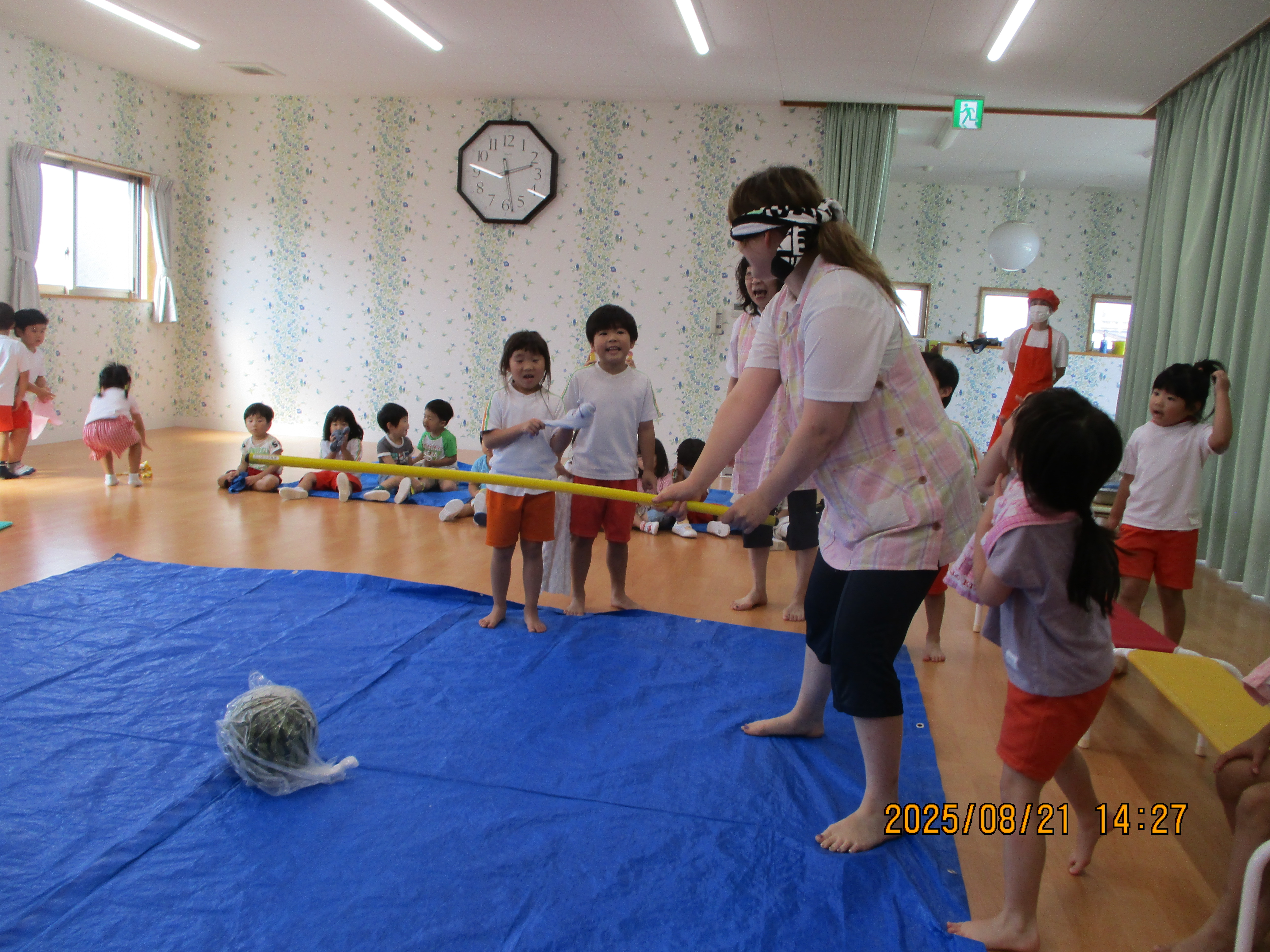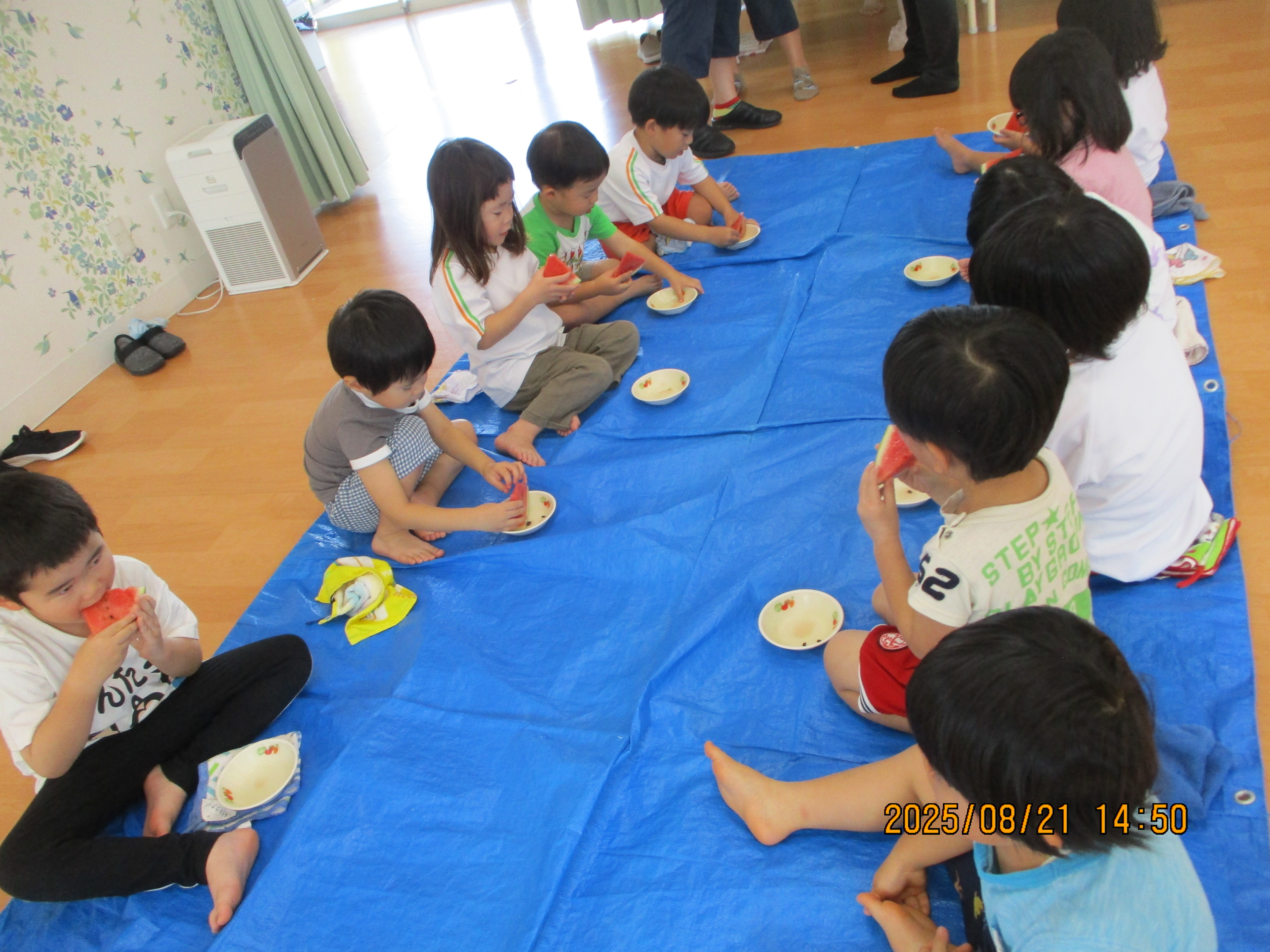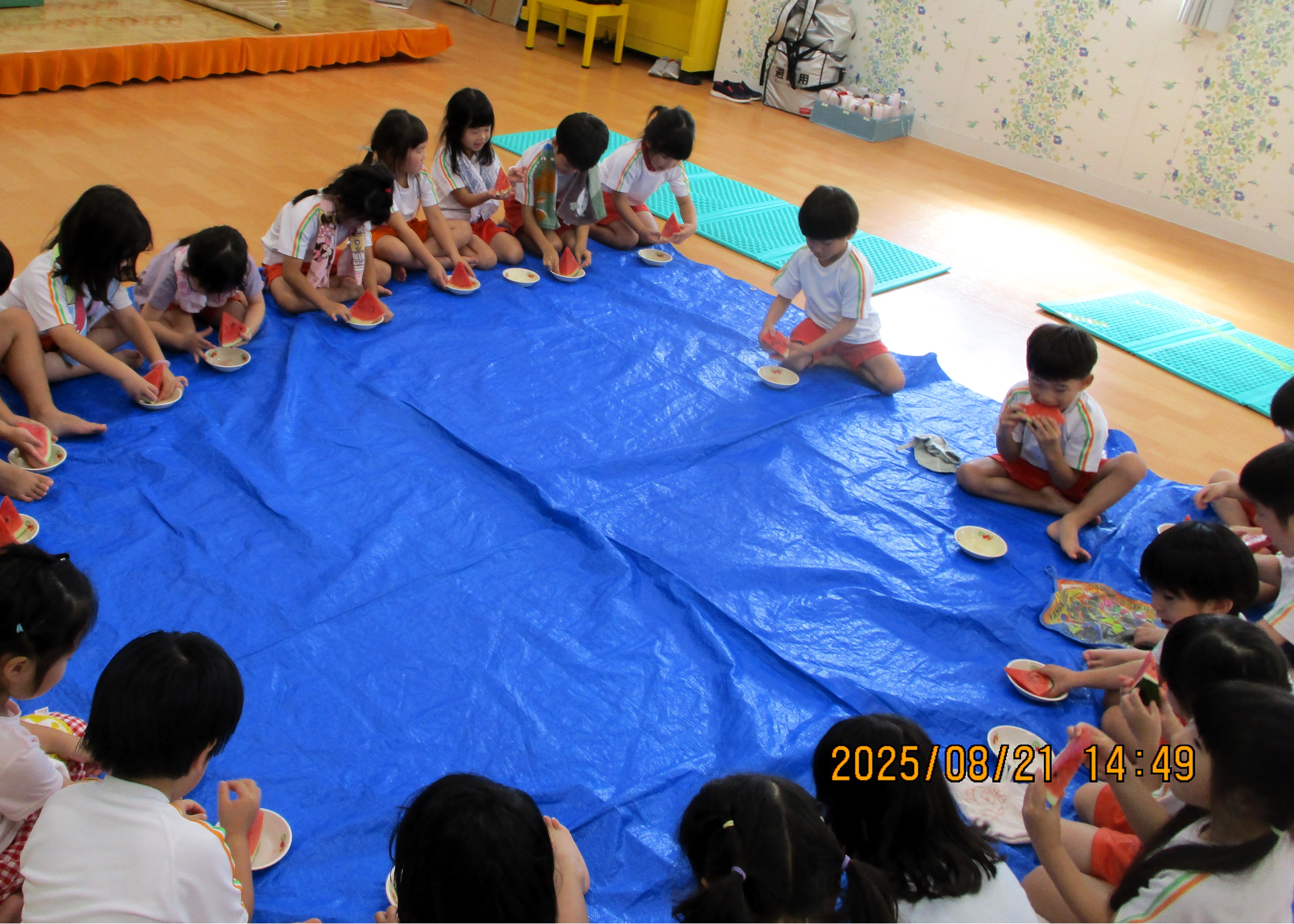 たいよう保育園2025.09.20 たいよう保育園名物!すいか割り大会!! 8/21たいよう保育園名物のすいか割りがありました。 毎年楽しみにしている行事です。 年少さんと年中さんの見守るなか、年長さんが目隠しをして、友だちの声を頼りにすいかの位置をたどります。 毎年、大声援で大盛り上がりです。 最後はみんなでおいしくいただきました。