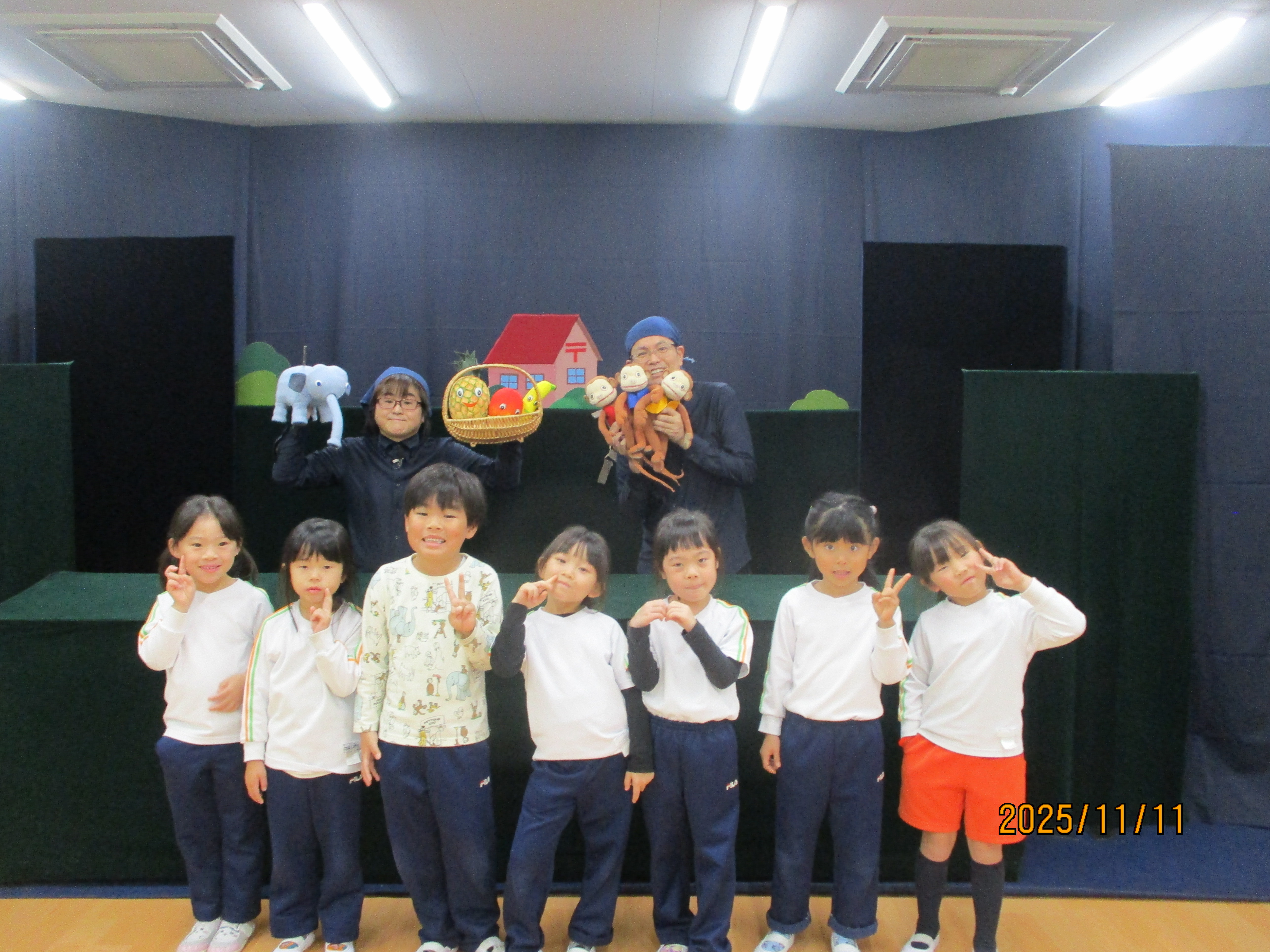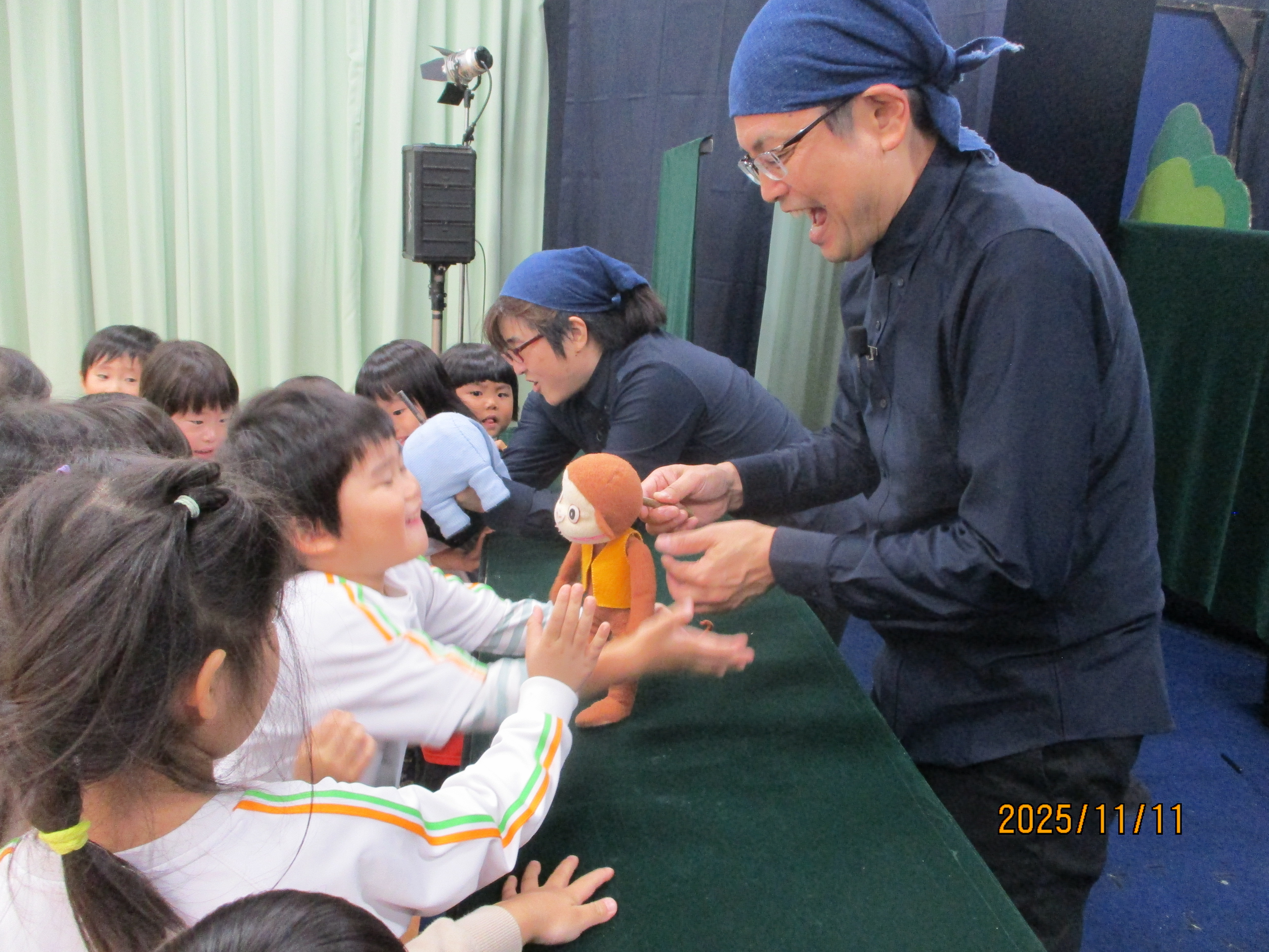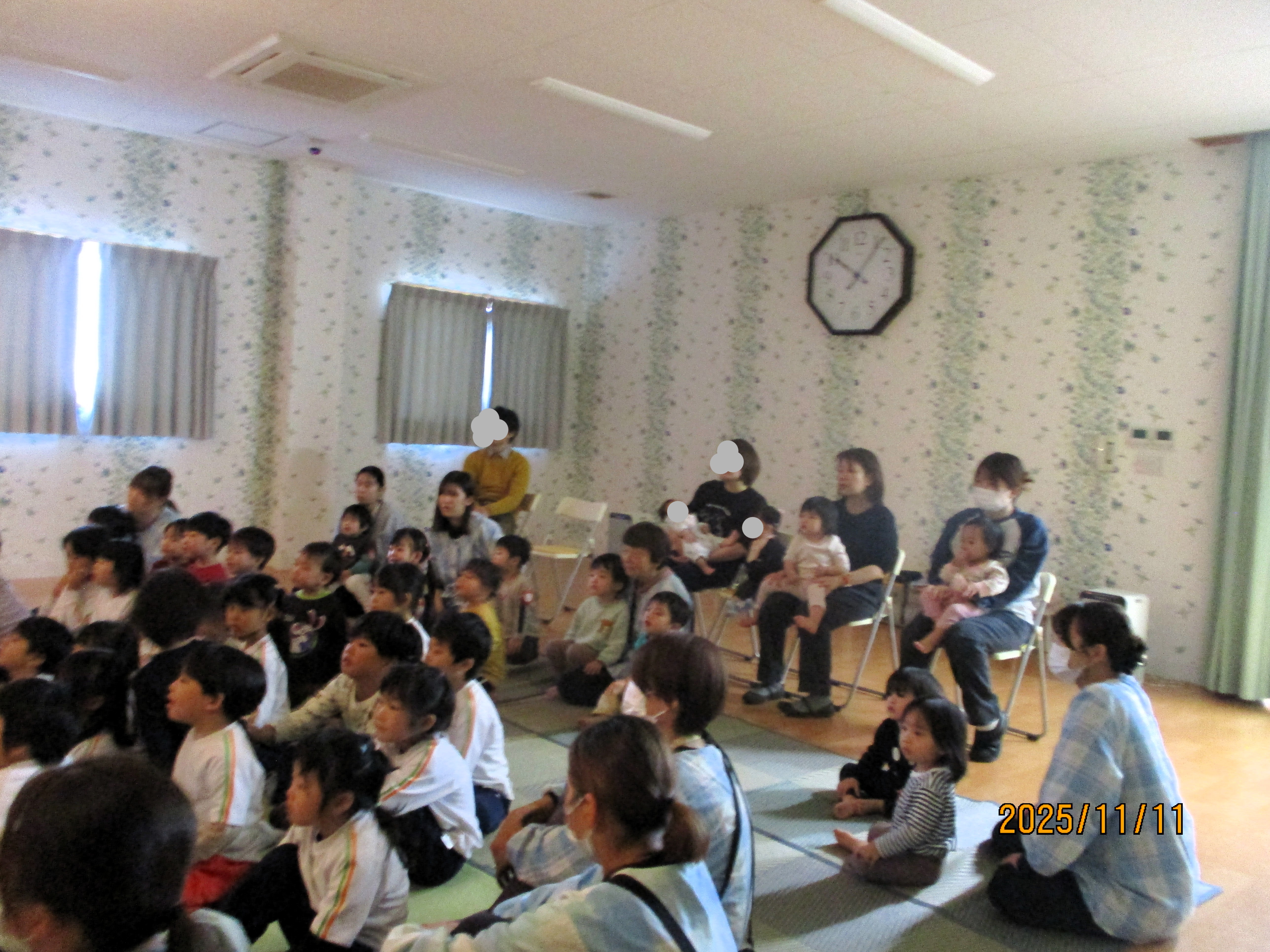 たいよう保育園2025.11.20 11月人形劇観劇に来ていただきありがとうございました。 11/11の地域の方を招いての観劇に、ご参加頂きありがとうございました。 三重の人形劇団”どむならん"さんに来て頂き、短いお話を4話楽しみました。 小さい子から年長、大人まで、引き込まれ、大笑いできる、とても楽しい時間でした。 これからも、地域の方を招いて、このようなワクワクする事を企画していこうと思います。 良かったら遊びに来てくださいね。