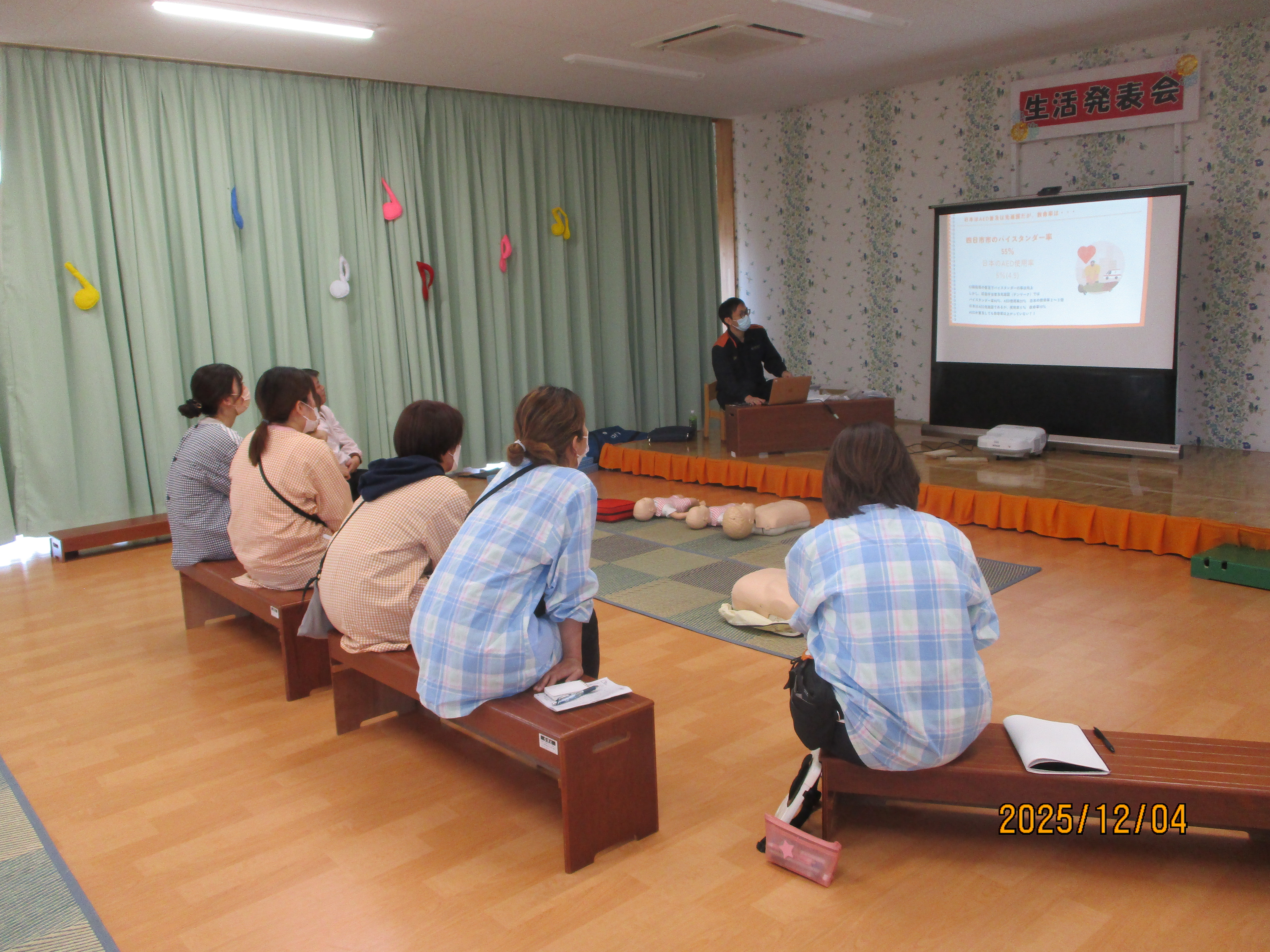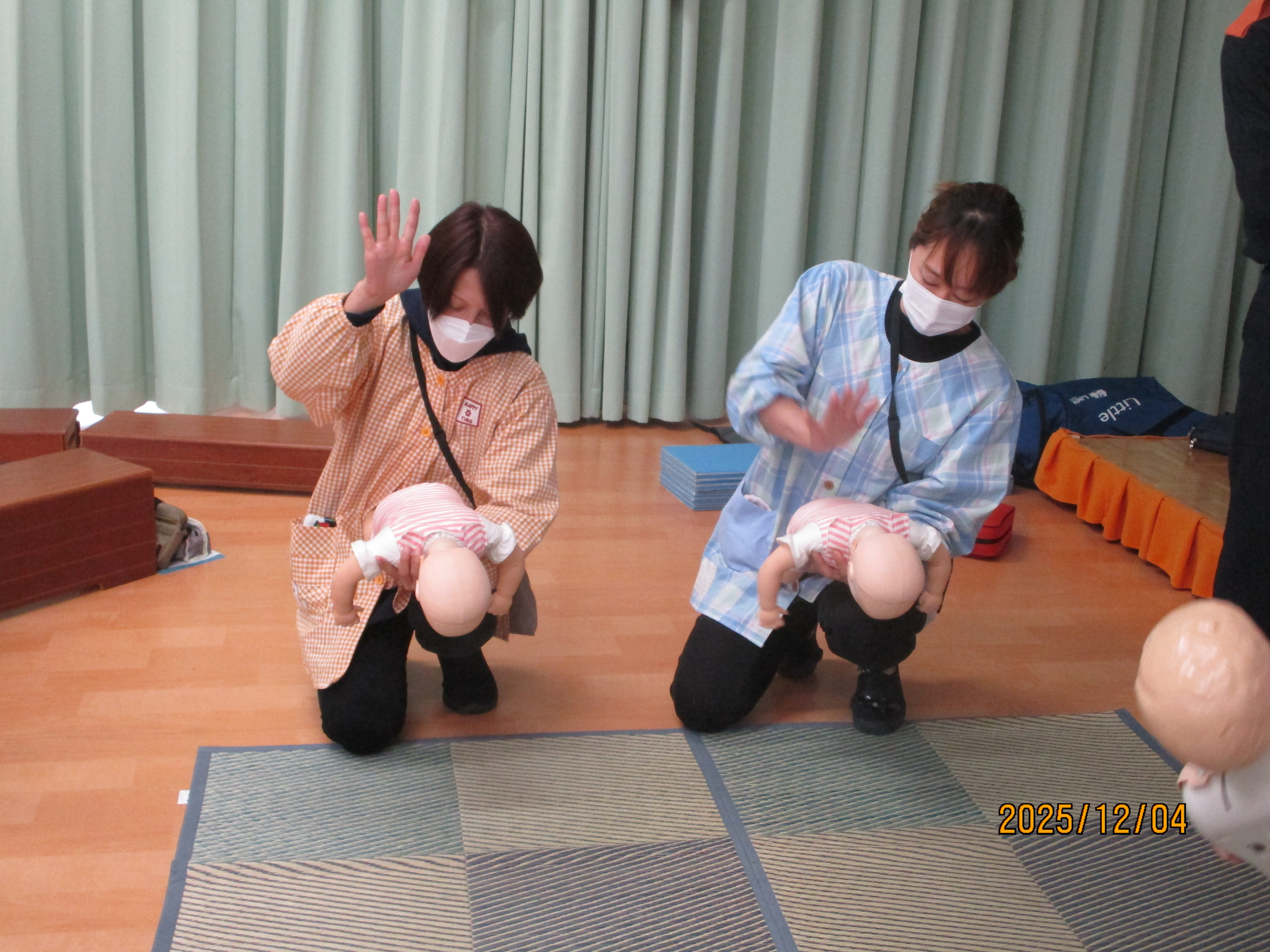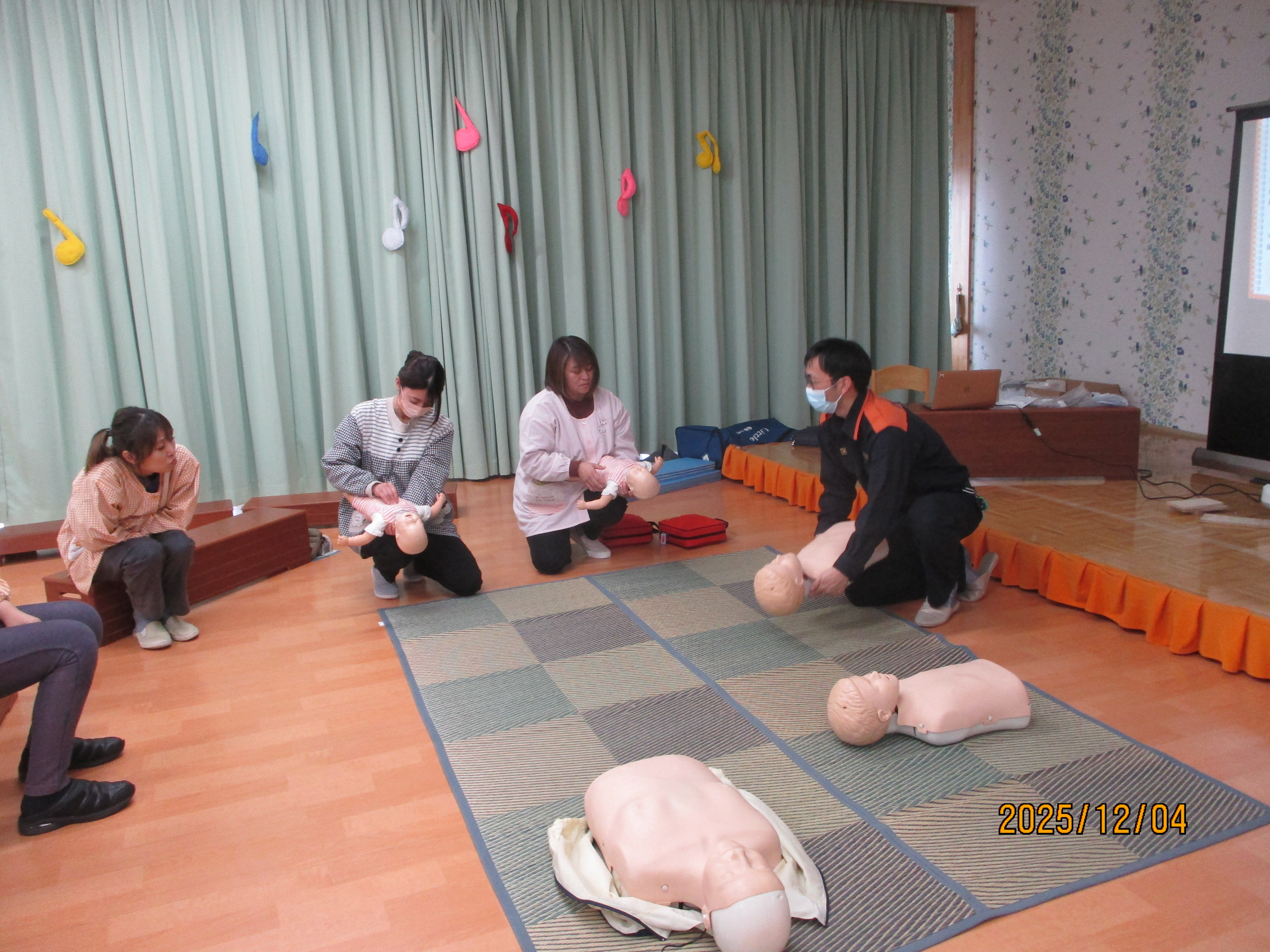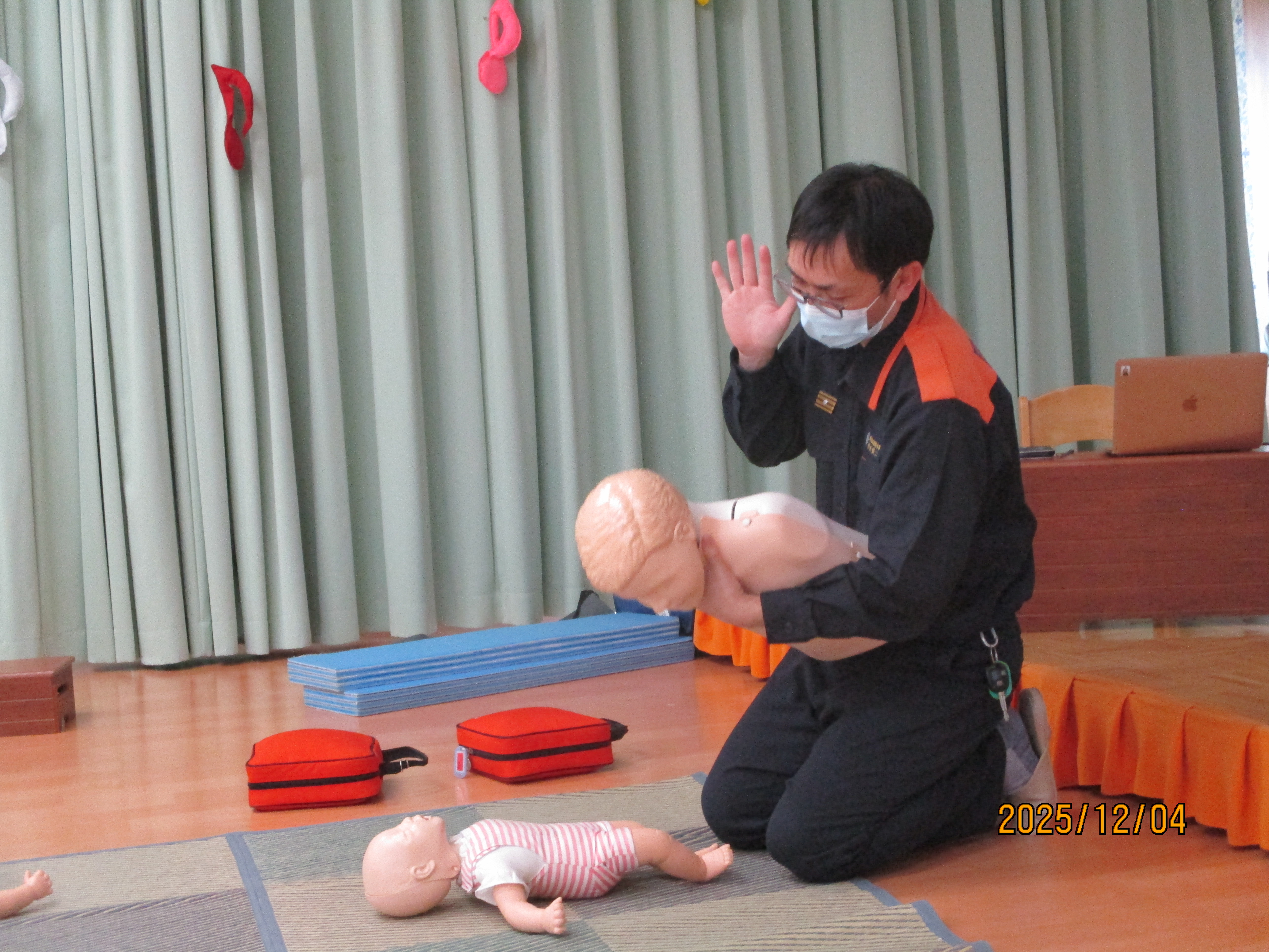 たいよう保育園2025.12.06 誤嚥の時の対処法の研修を受けました。 中消防署の方に来ていただき誤嚥の時の対処法の研修を受けました。 嚥下のメカニズムや、どのようなものを食べた時に起こりやすいか、どのような対処が望ましいかなどを学び、実際に模型を使い背部叩打法と腹部突き上げ法、胸骨圧迫を教えていただきました。 このようなことはあってはなりませんが、もしもの場合に備えて研修を受けたり、日々の5分ごとの睡眠チェックを、しっかり行っていきたいです。